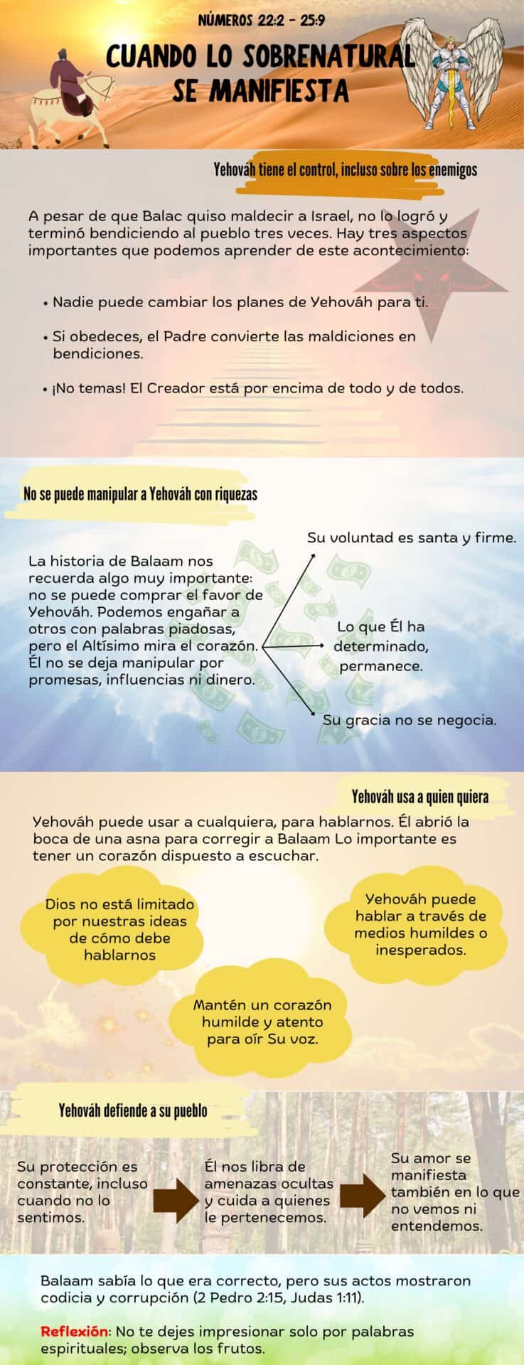 Esta historia nos enseña varias lecciones valiosas. En primer lugar, nos recuerda la importancia de la emunáh (fe) y la confianza en Yehováh, especialmente en momentos de dificultad y peligro. También se destaca la necesidad de la integridad y la honestidad, ya que Balaam, a pesar de sus intenciones iniciales, finalmente obedece la Palabra de Yehováh y pronuncia las palabras que Él le ordena. Además, la intervención del asna de Balaam nos enseña a ser sensibles a las señales y manifestaciones del Todopoderoso, que pueden venir de las fuentes más inesperadas. En resumen, la parashá de Balak nos invita a reflexionar sobre la soberanía de nuestro Padre, Su protección hacia su pueblo y la importancia de actuar con integridad y obediencia a sus mandamientos.