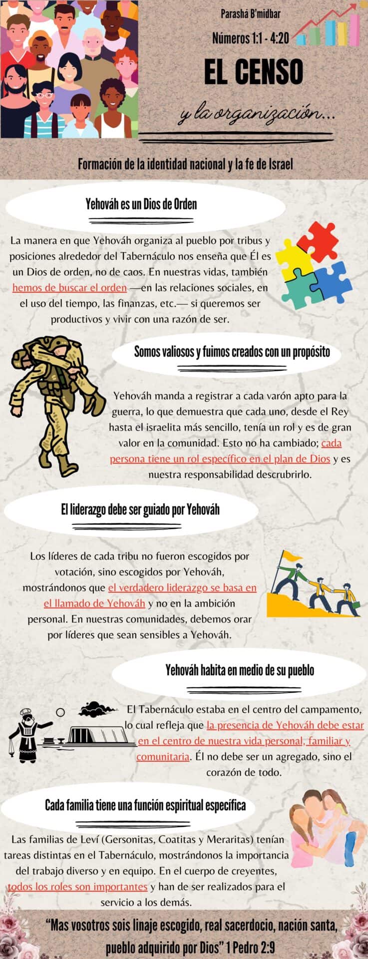 Todo esto ocurre en un momento crucial de la historia de los hijos de Israel, cuando están en transición entre su esclavitud en Egipto y su establecimiento como una nación libre en la Tierra Prometida. Habiendo recibido la Torá en el Monte Sinaí, los hijos de Israel ahora deben aprender a vivir y funcionar como una comunidad organizada bajo la guía de Yehováh. Tanto el censo como la organización que se nos narran en estos capítulos, eran pasos esenciales para la formación de la identidad nacional y la fe, asegurando que cada miembro de la comunidad tuviera un papel definido en el funcionamiento de la nación y en el desarrollo del culto a Dios.