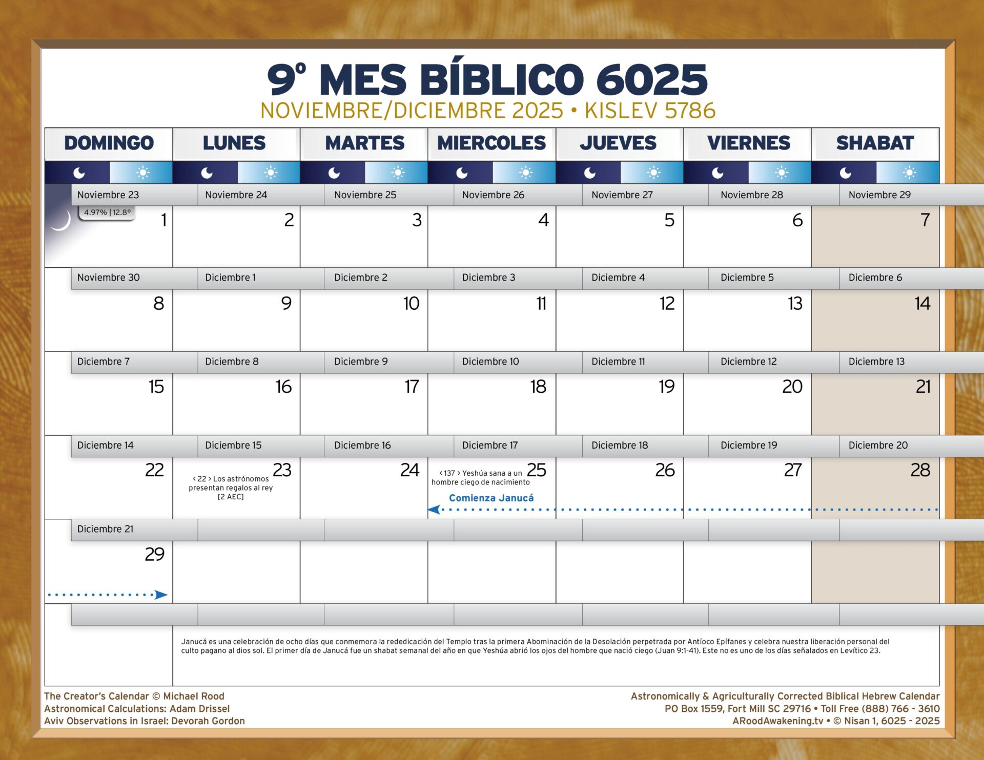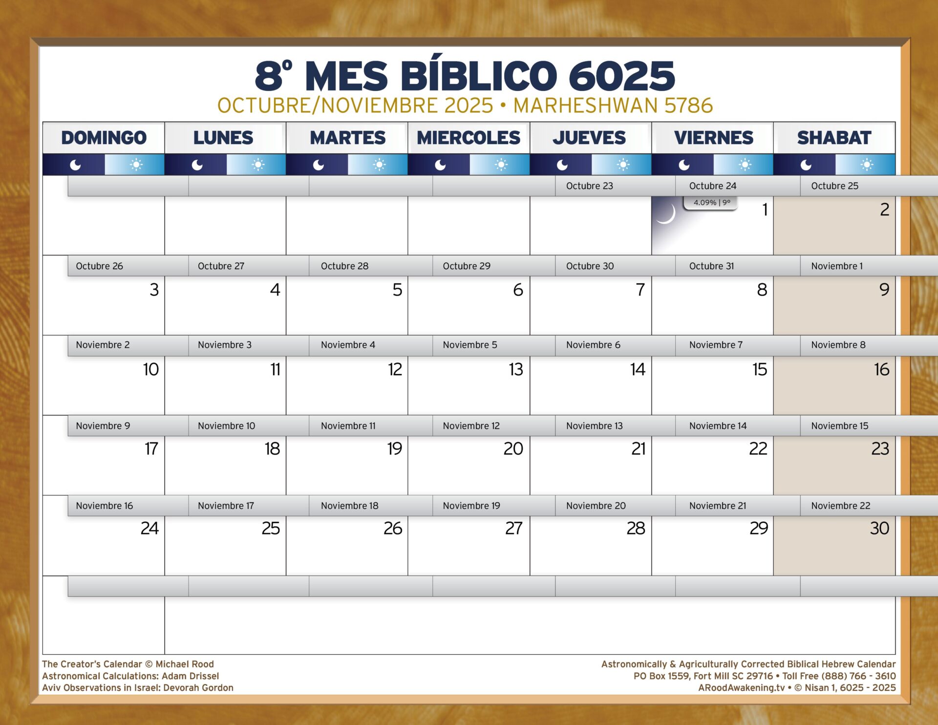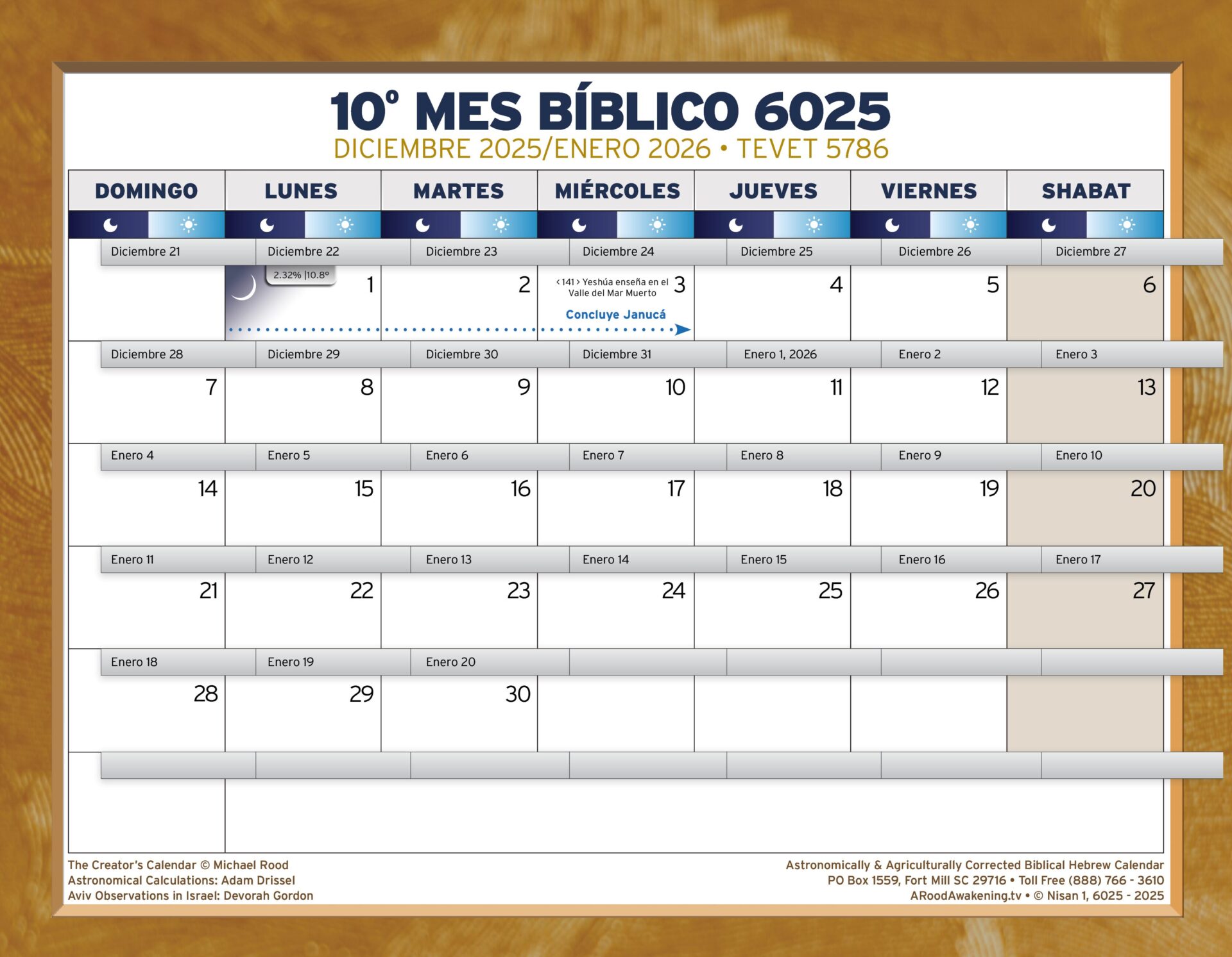 En Un Rudo Despertar, creemos que el mes bíblico comienza cuando la luna es avistada en la tierra de Israel a simple vista, sin la ayuda de herramientas como binoculares o telescopios, tal como se practicaba en tiempos bíblicos. Este calendario, único en su clase, utiliza datos de la NASA para determinar con precisión la historia bíblica y calcular el tiempo de la misma manera en que lo hizo Yeshúa: siguiendo el calendario original de YeHoVaH, y no un sistema creado por el hombre.