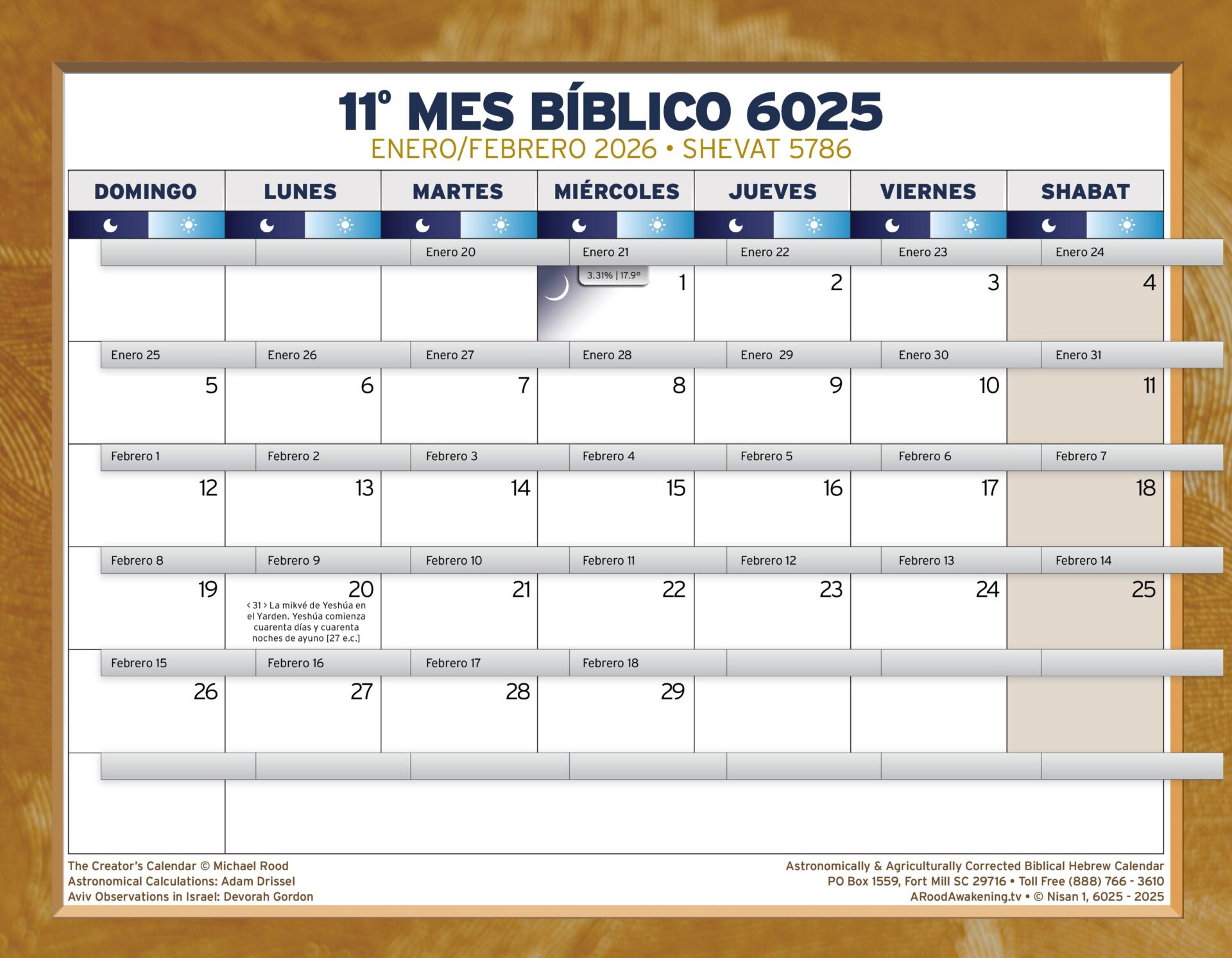 En Un Rudo Despertar, creemos que el mes bíblico comienza cuando la luna es avistada en la tierra de Israel a simple vista, sin la ayuda de herramientas como binoculares o telescopios, tal como se practicaba en tiempos bíblicos. Este calendario, único en su clase, utiliza datos de la NASA para determinar con precisión la historia bíblica y calcular el tiempo de la misma manera en que lo hizo Yeshúa: siguiendo el calendario original de YeHoVaH, y no un sistema creado por el hombre.