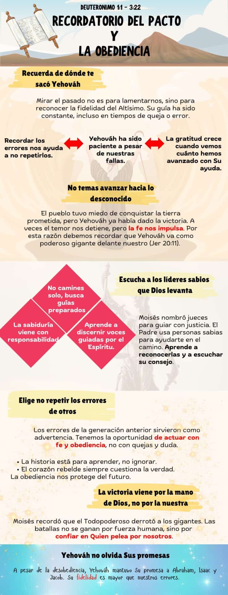 Enseñanza: Aprender de los errores. El hecho de que Moisés repase con detalle las faltas y las quejas del pueblo, demuestra un deseo de parte de él de que el pueblo no repita los mismos errores en el futuro. Y de la misma manera, tal como lo dice Pablo en su primera carta a los Corintios: “Y estas cosas les acontecieron como ejemplo, y están escritas para amonestarnos a nosotros, a quienes han alcanzado los fines de los siglos” 1 Corintios 10:11.
