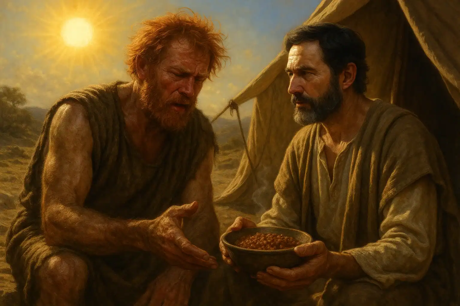 29Y guisó Jacob un potaje; y volviendo Esaú del campo, cansado, 30dijo a Jacob: Te ruego que me des a comer de ese guiso rojo, pues estoy muy cansado. Por tanto fue llamado su nombre Edom. 31Y Jacob respondió: Véndeme en este día tu primogenitura. 32Entonces dijo Esaú: He aquí yo me voy a morir; ¿para qué, pues, me servirá la primogenitura? 33Y dijo Jacob: Júramelo en este día. Y él le juró, y vendió a Jacob su primogenitura. 34Entonces Jacob dio a Esaú pan y del guisado de las lentejas; y él comió y bebió, y se levantó y se fue. Así menospreció Esaú la primogenitura.